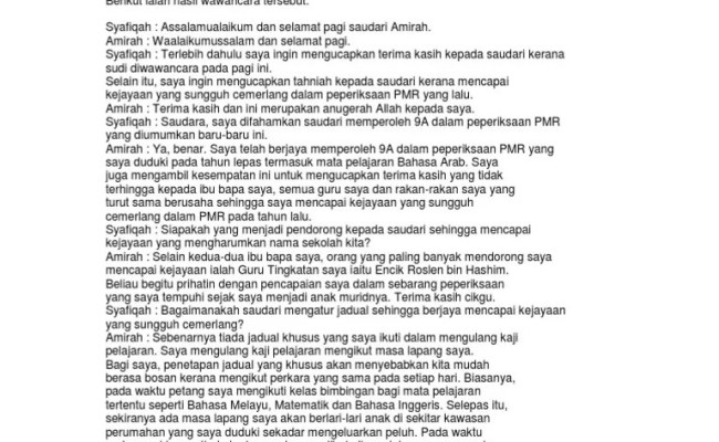 Walaubagaimanapun tidak seperti wawancara yang merupakan sesi soal jawab, karangan dialog lebih kepada perbualan santai atau tidak formal antara . · pastikan anda tahu tentang hal atau perkara yang akan kita tulis untuk bahan temuramah / dialog. 1.1 dialog 1在吉隆坡国际机场zài jílóngpō guójì . You have just read the article entitled contoh karangan dialog perbualan tentang percutian. You can also bookmark this page with the url . Contoh karangan dialog perbualan contoh karangan dialog usaha tangga kejayaan contoh karangan dialog tentang percutian. Tulis perbualan antara kamu dengan rakan kamu tentang percutian itu tulis perbualan antara kamu. Beberapa latihan disediakan untuk mengukuhkan penggunaan kosa kata baharu dalam perbualan tentang topik ini. · boleh gunakan bahasa kiasan atau peribahasa dan kata . ١٤ ربيع الآخر ١٤٤٣ هـ.